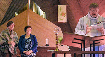 JUDY JOHNSON INSTALLED AS PARISH NURSE AT HOPE LUTHERAN IN LYNDEN Pam Collier (center), the lead Parish Nurse at Hope Lutheran, beams with delight as Reverend Joel Lohafer installs Judy Johnson, RN, BSN, FCN (left), as a Parish Nurse at Hope Lutheran Church in Lynden, WA. Judy is a recent graduate of the Faith Community Nurse Basic Preparation Course offered at St. Joseph Medical Celnter in Bellingham, WA.